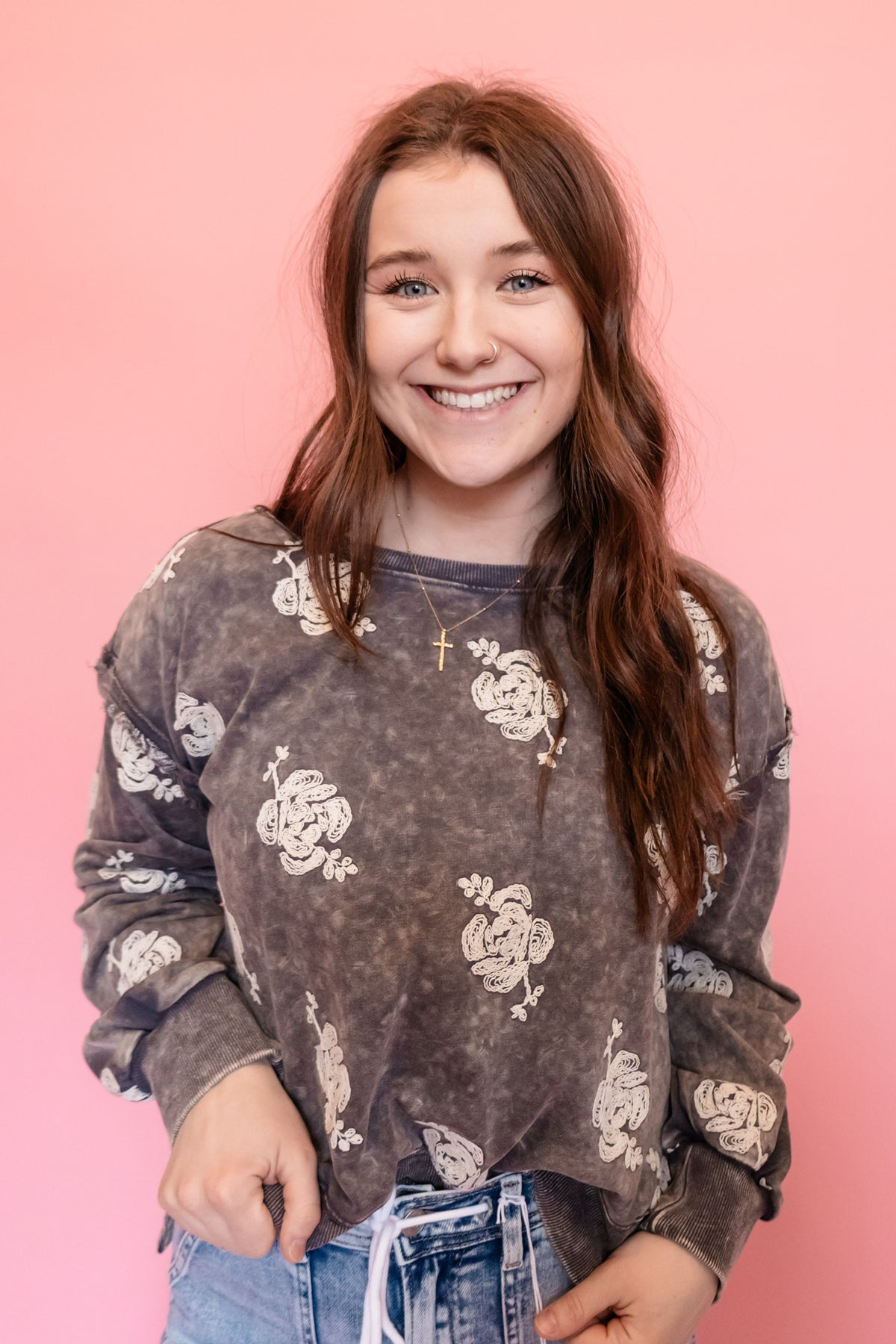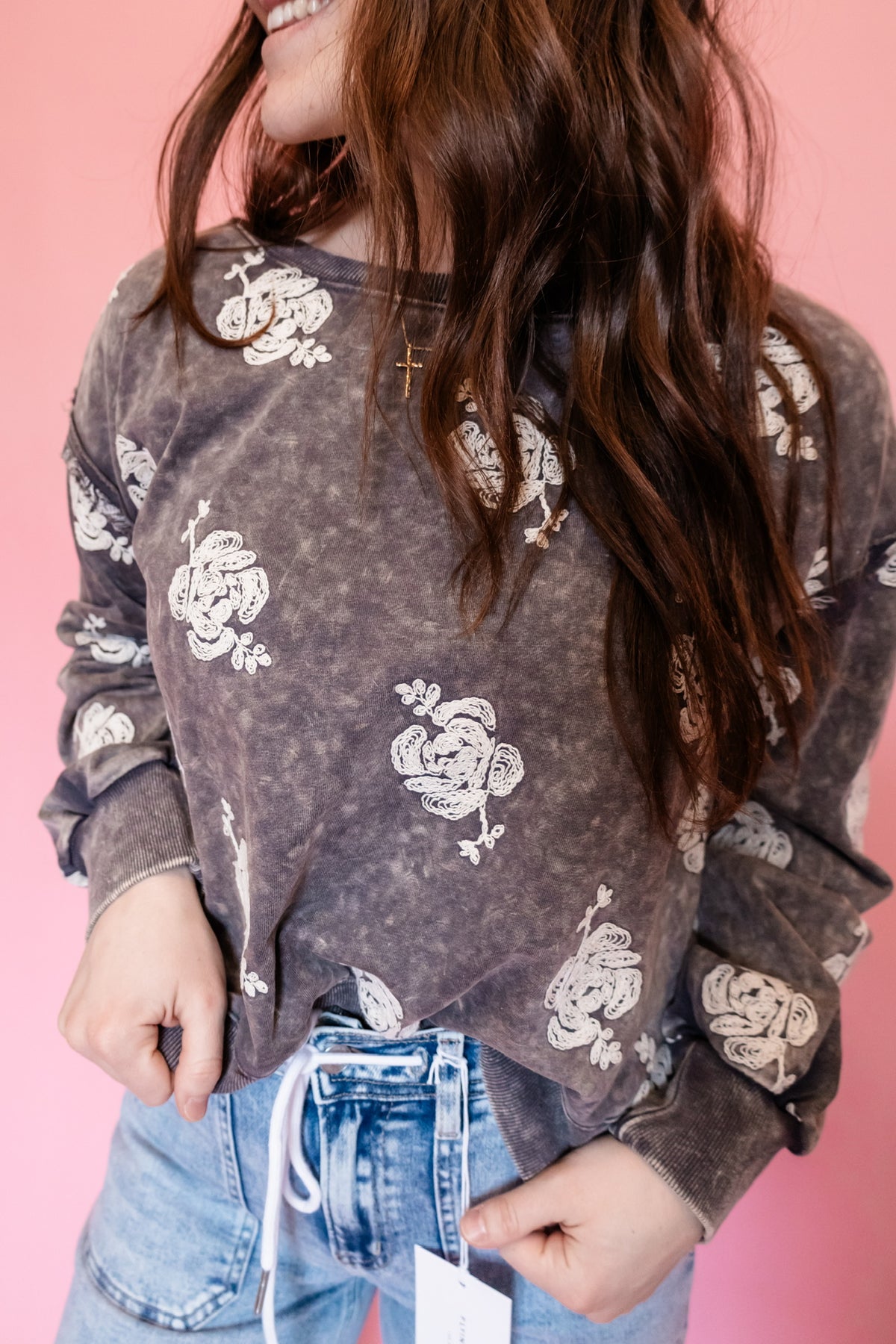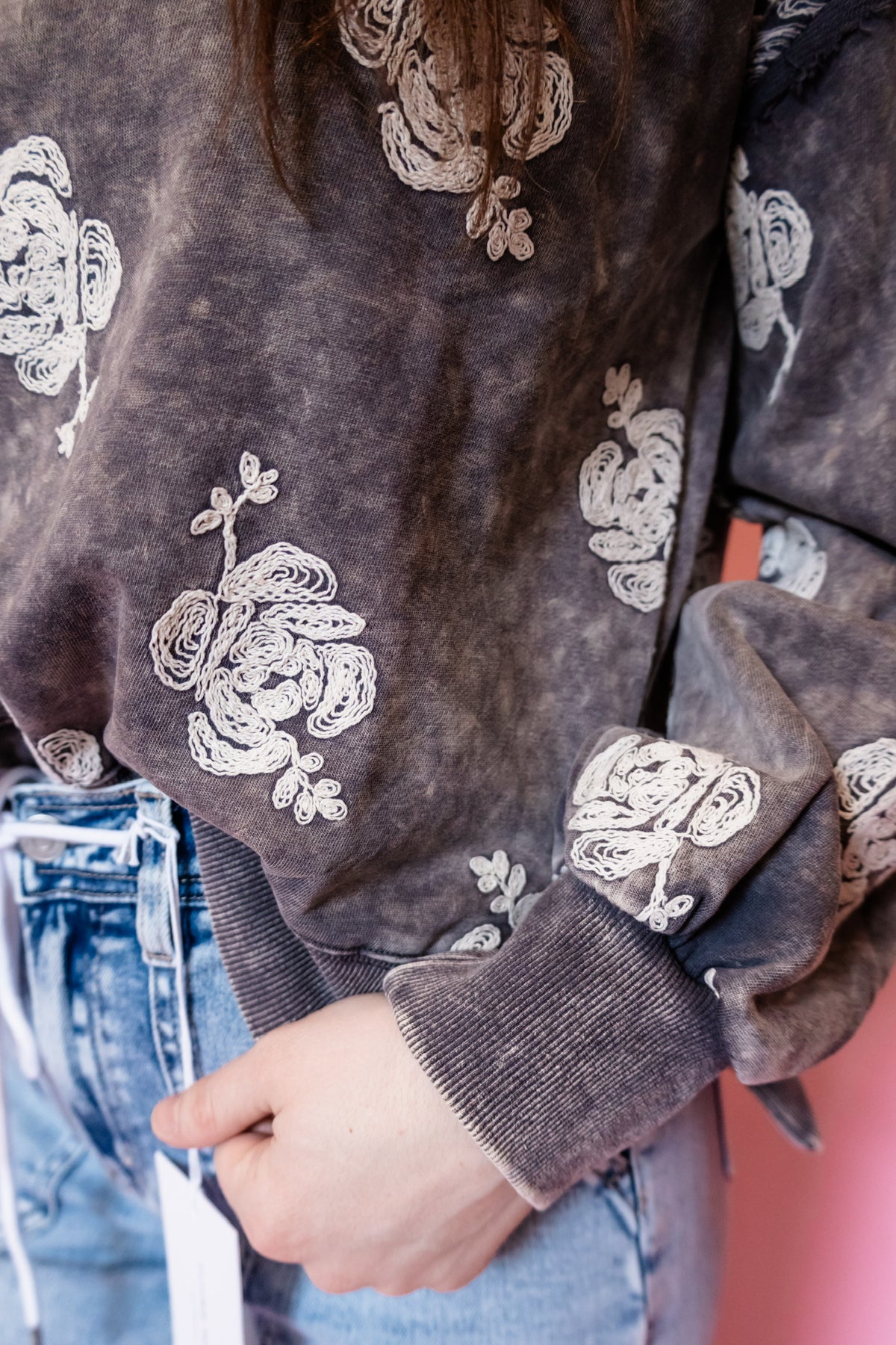 Our washed charcoal crew is that effortless throw-on you’ll live in — with the prettiest touch of cream lace embroidery to make it feel extra special. The perfectly worn-in wash gives it that vintage vibe, while the delicate stitching keeps it feminine and elevated.