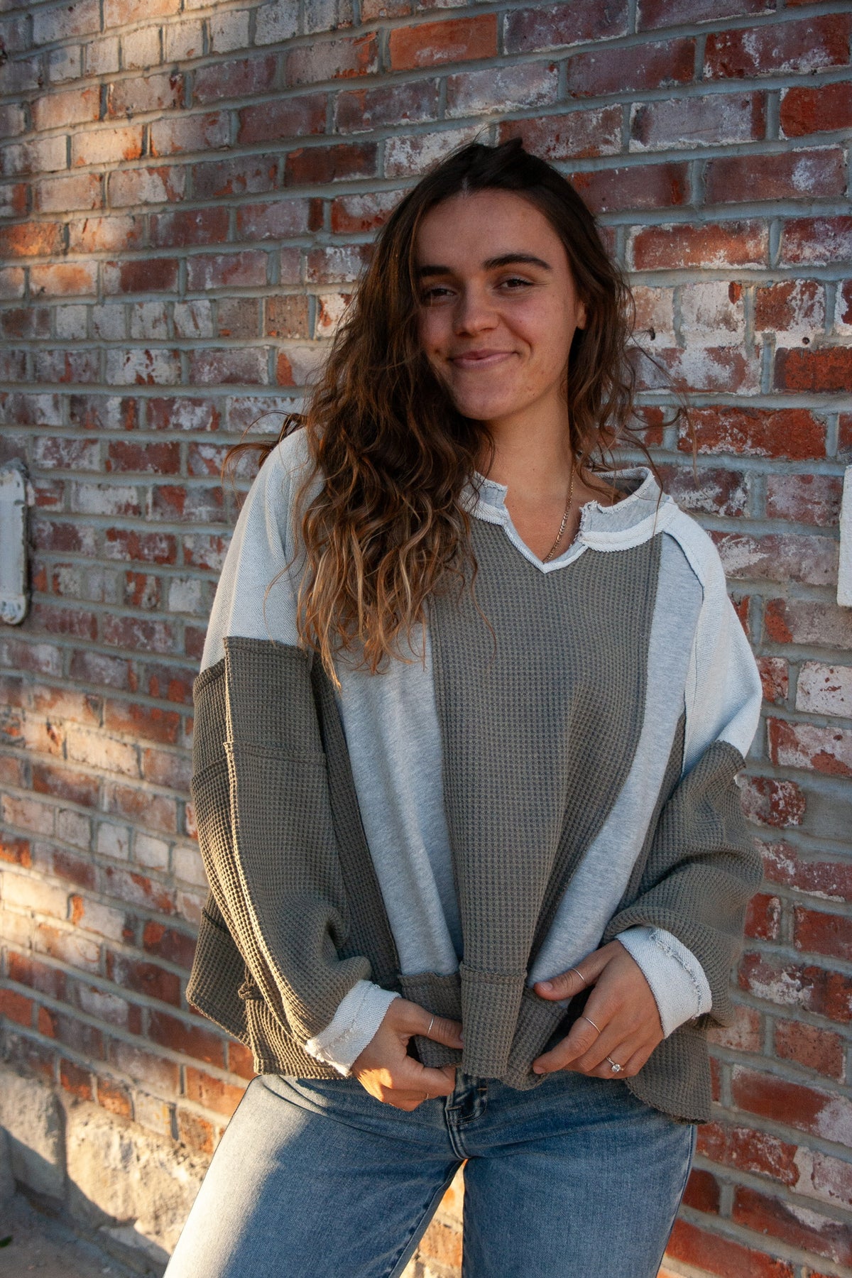 Cozy meets effortlessly cool in the Top Notch Thermal. Designed with a relaxed, oversized fit, this long sleeve thermal top is your new go-to for laid-back layering. The soft waffle-knit fabric keeps things comfy, while solid trim detailing adds a clean, elevated edge. A notched V-neckline gives it just the right amount of attitude—perfect for pairing with your favorite denim or leggings. Whether you're lounging or out and about, this top delivers comfort without compromising style.