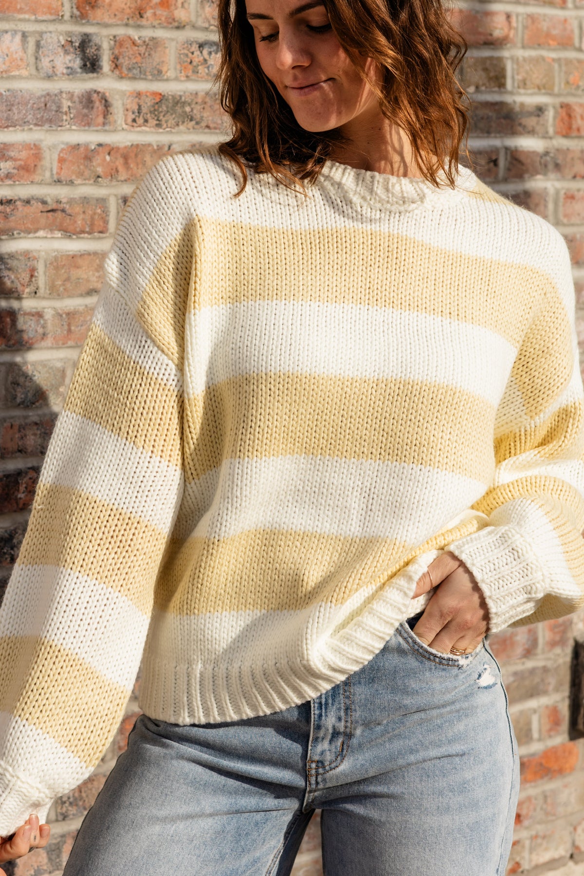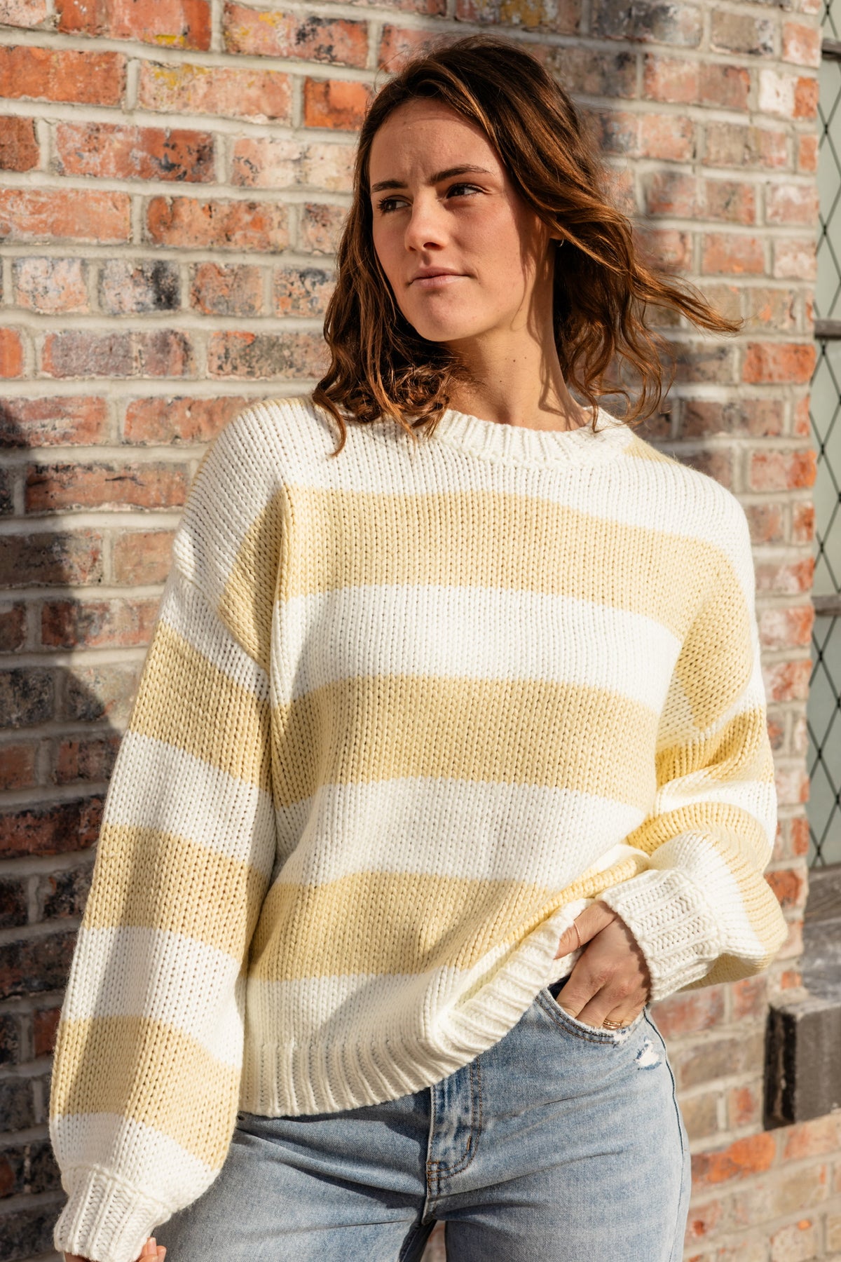 Wrap yourself in effortless charm with the Buttercream Breeze sweater. This ivory and butter–striped knit brings a soft, sun-kissed palette to cooler days, while the wide neckline adds a relaxed, subtly feminine touch. Crafted in a chunky, cozy weave with an easy long sleeve silhouette, it’s the perfect blend of comfort and style. Pair it with denim for weekend strolls or layer it up for a chic, laid-back look all season long.
