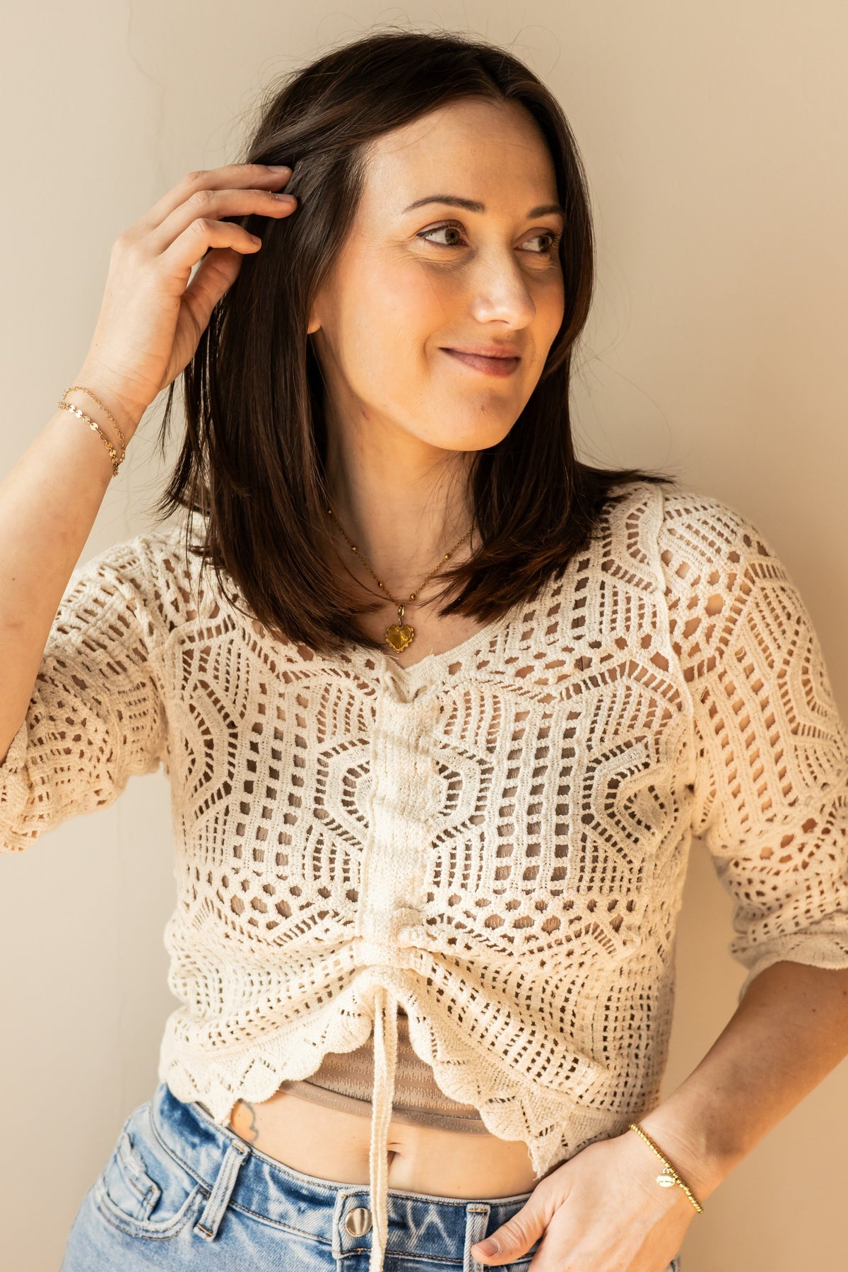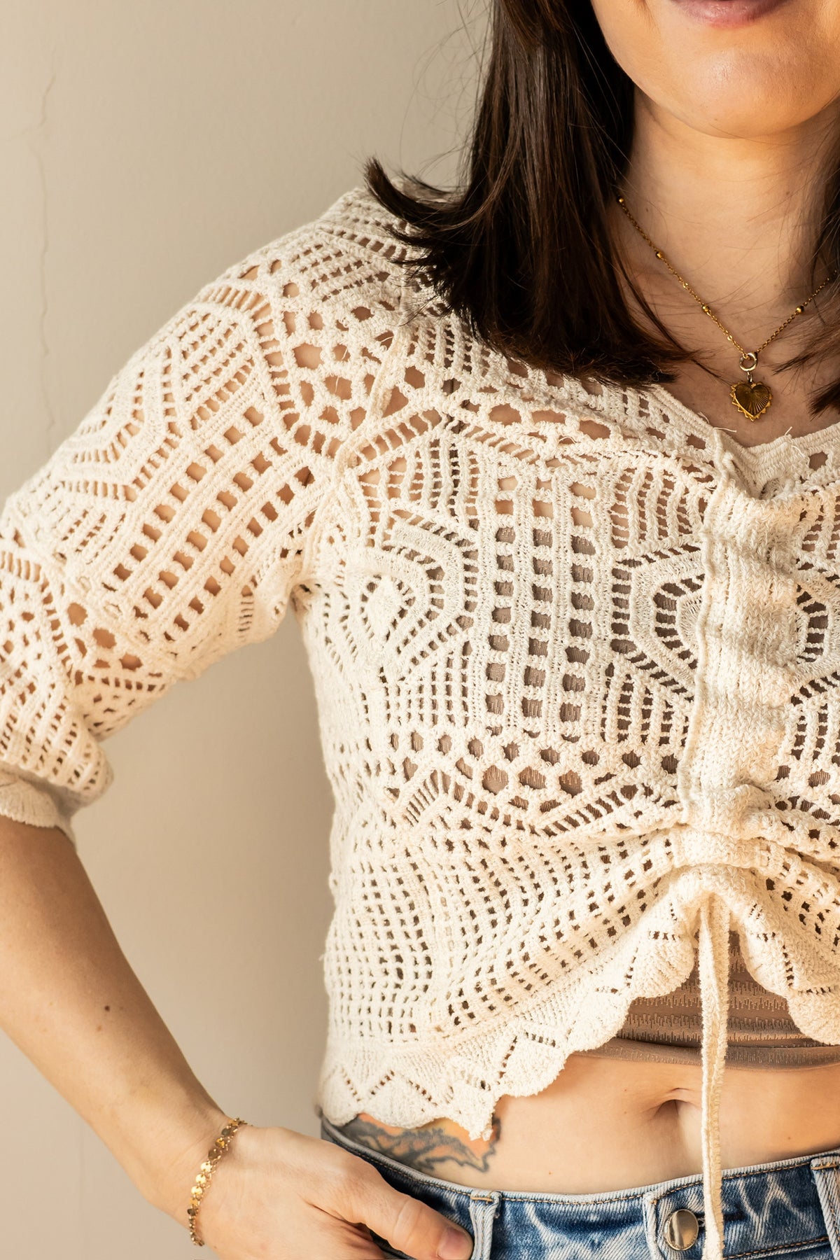 Embrace effortless elegance with this dreamy crochet top, crafted from delicate openwork that lets your skin breathe. The adjustable drawstring accent at the hem adds a touch of playful sophistication, allowing you to customize the fit to your preference. Perfect for layering over a slip or wearing solo, this piece transitions seamlessly from casual days to relaxed evenings. The lightweight construction makes it ideal for warm weather styling, while the timeless crochet texture ensures you'll reach for it season after season.