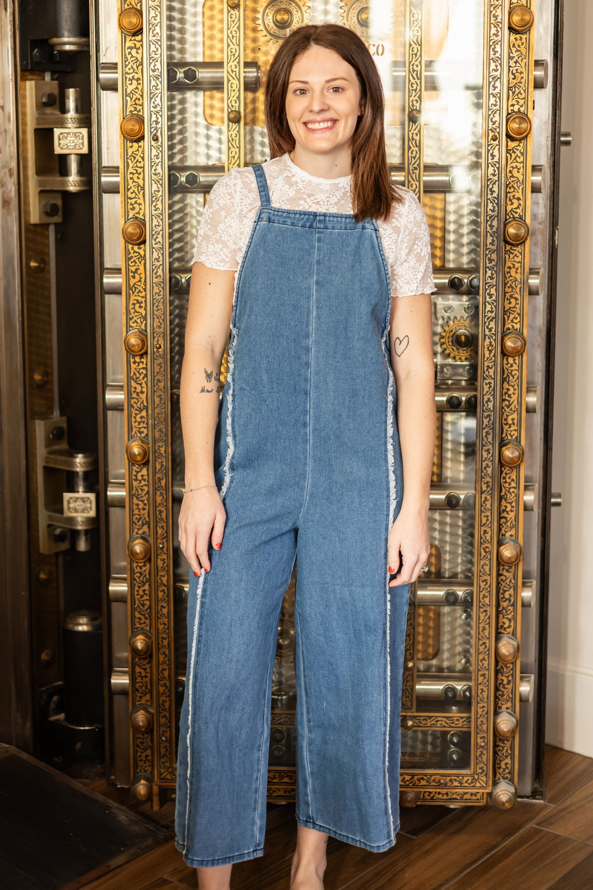 Walk in effortless style with these relaxed denim overalls, featuring a distinctive frayed texture that runs down the front of each leg. The playful distressing adds visual interest and movement to a timeless silhouette, while the classic overall design offers practical pockets and adjustable straps for all-day comfort. Perfect for casual outings, weekend adventures, or laid-back everyday wear. Pair with your favorite tee or tank for an understated look that feels both comfortable and intentionally curated.