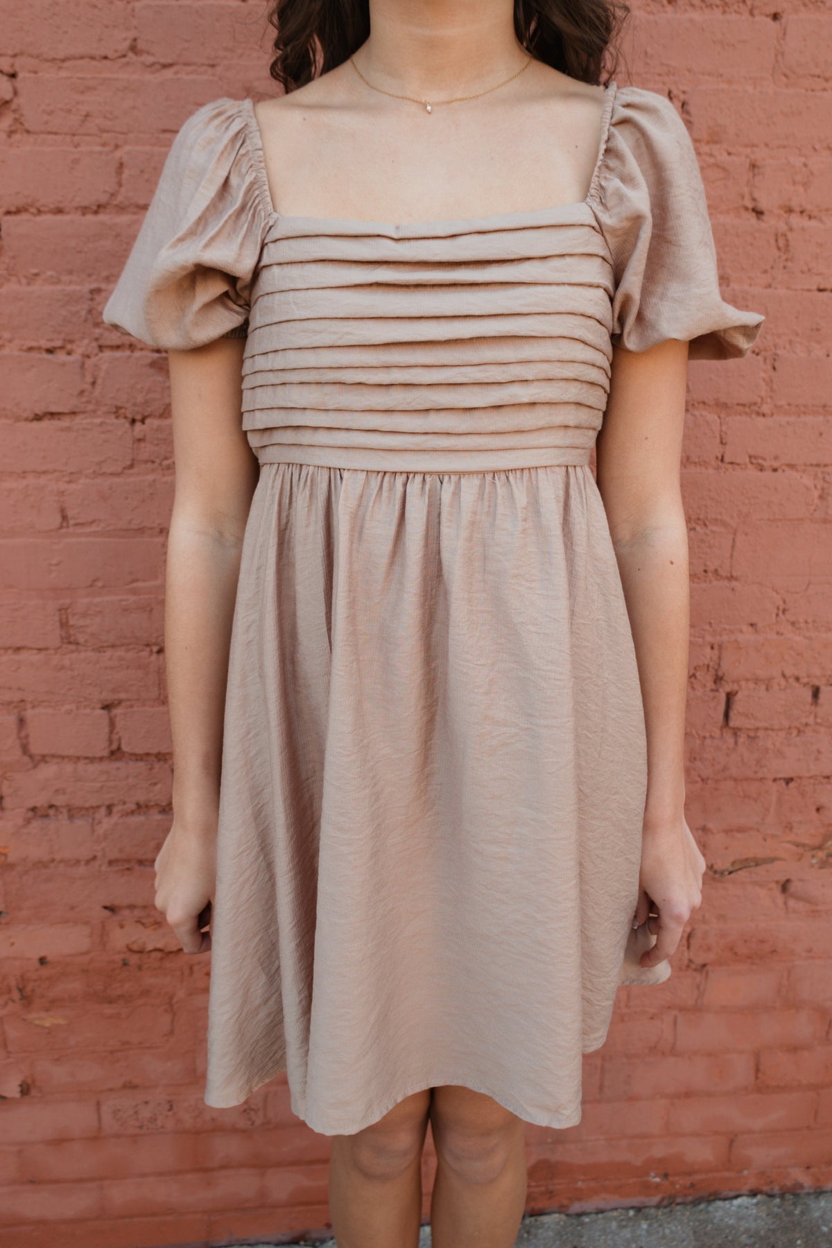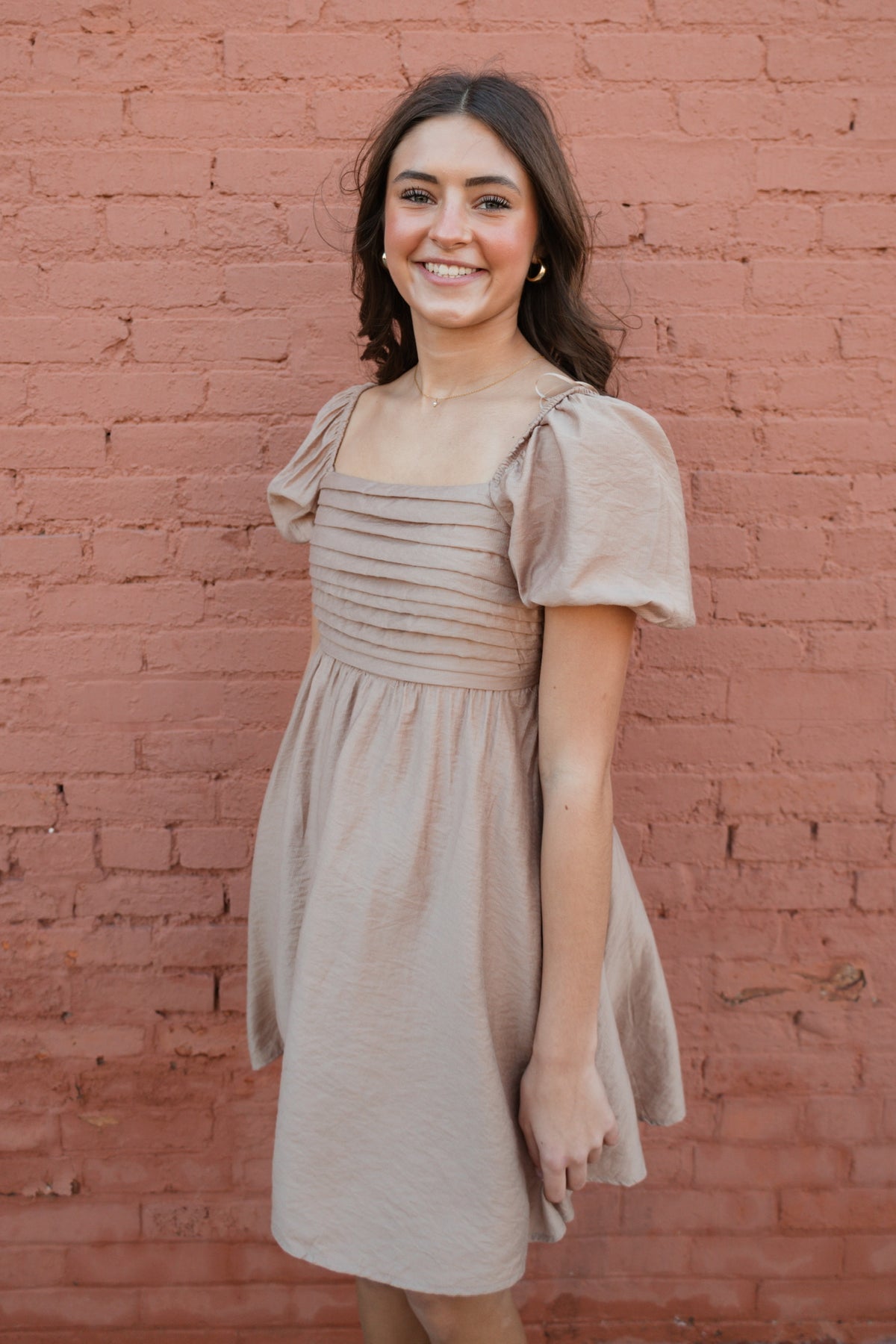 The Honey Harbor Mini is your go-to dress for effortless charm. This tan mini features a flattering pleated bodice that adds dimension and movement, paired with adorable short puff sleeves that frame the shoulders perfectly. The relaxed silhouette keeps things breezy and comfortable, making it ideal for casual outings, weekend brunches, or spontaneous adventures. Slip it on with your favorite sneakers or sandals for an instantly put-together look that feels anything but basic.