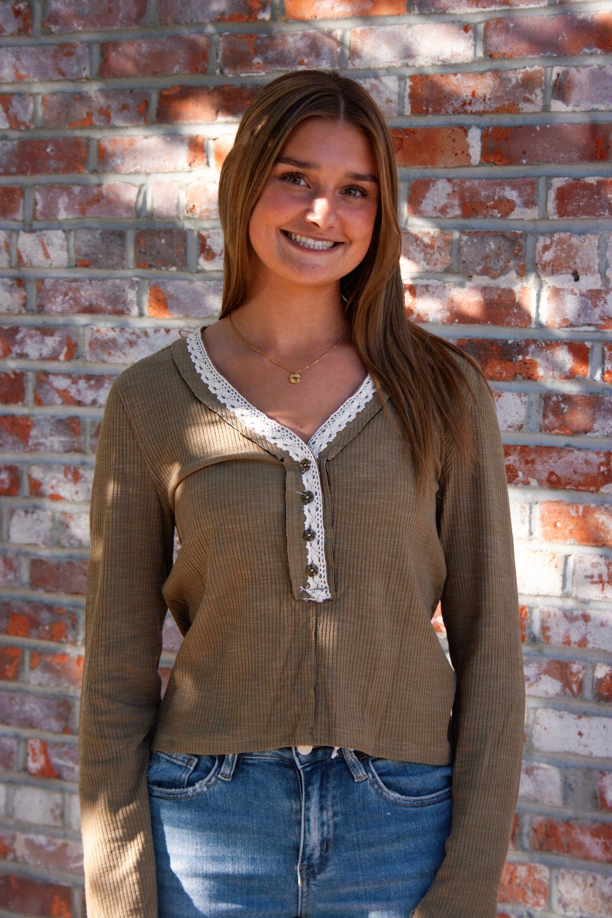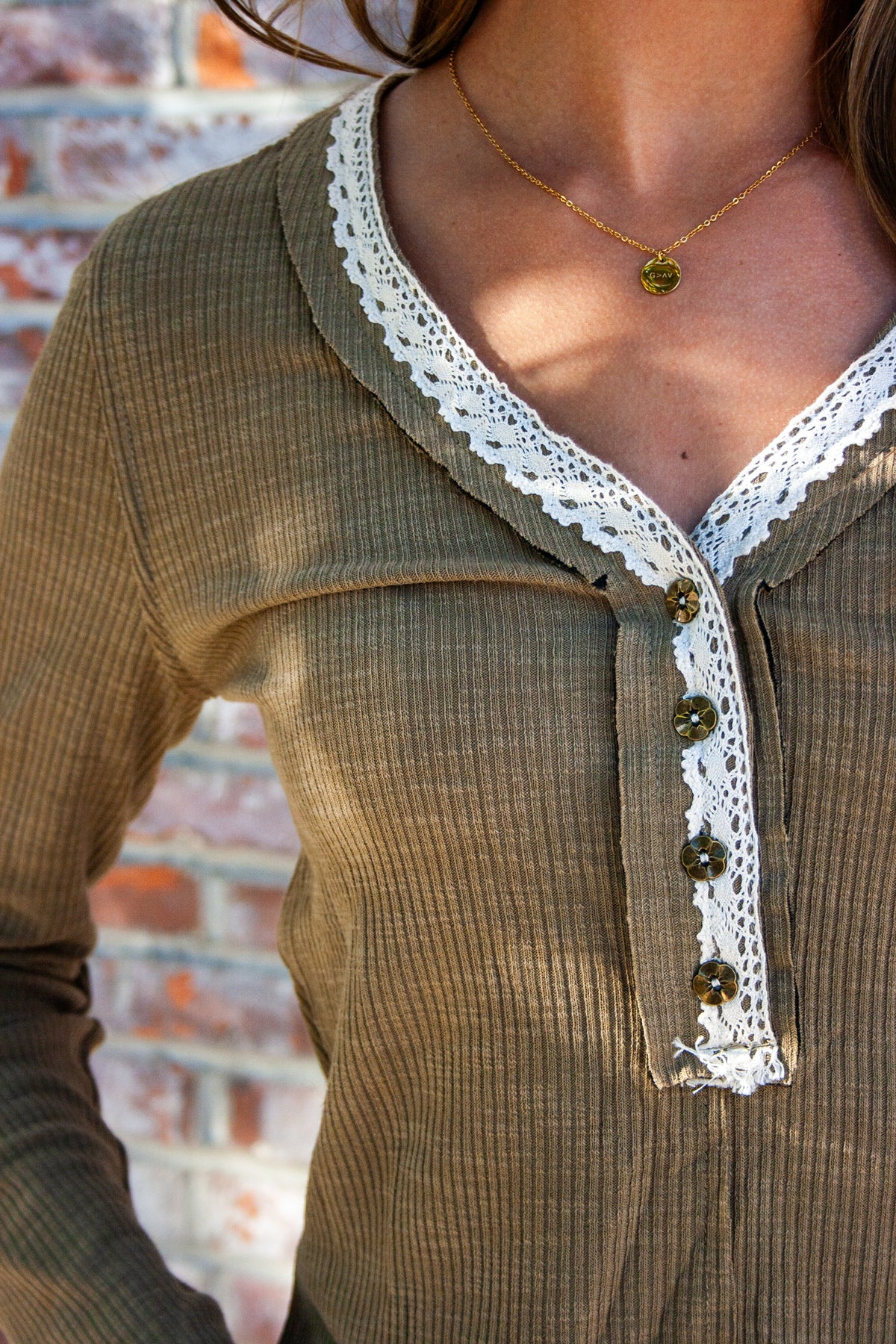 The Little Olive Tee features a calming olive hue with a relaxed fit designed for everyday comfort. Its long sleeves and V-neckline are enhanced by delicate crochet trim and floral seam down the back adding subtle texture and charm. The Henley-style buttons create a casual yet refined look, while the ribbed fabric ensures a soft, flexible feel that moves with you throughout the day. This tee effortlessly blends ease and style for a quiet, laid-back vibe.