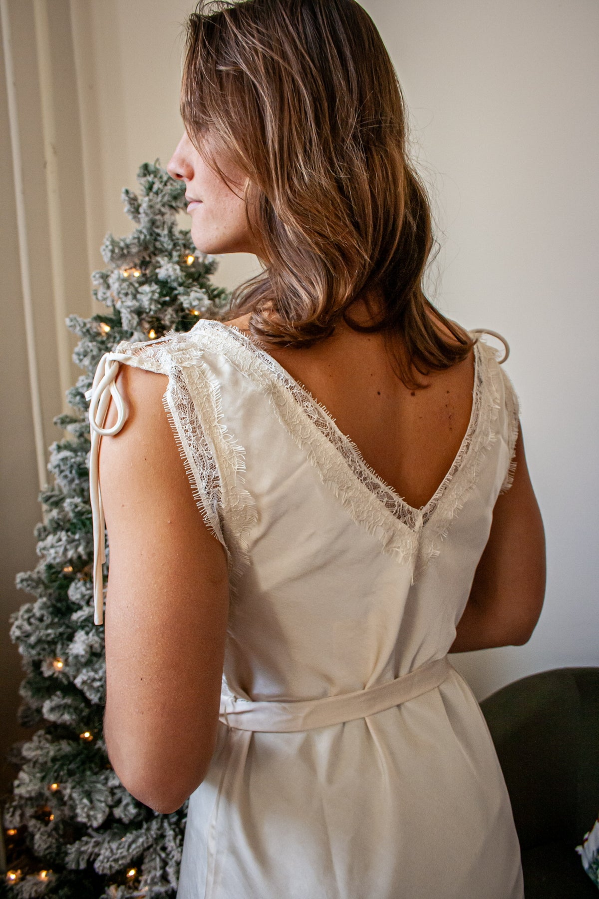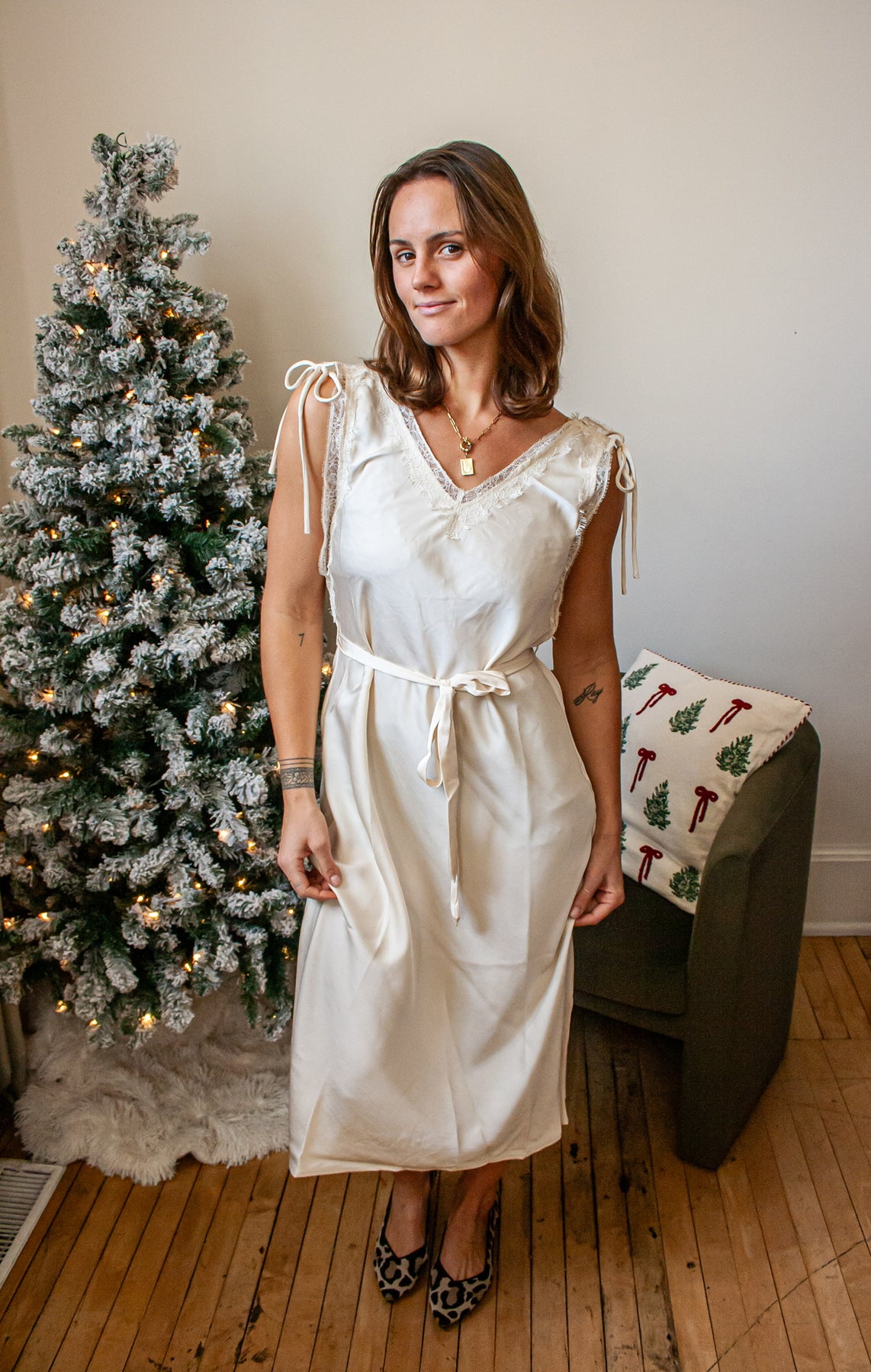 Satin Slip — Effortlessly elegant, the Satin Slip Dress in cream is a timeless wardrobe essential. Crafted from smooth, silky fabric, it features delicate tie straps and intricate lace trim that add a touch of romance and femininity. Its flattering silhouette and flowing drape make it perfect for layering under knits, pairing with heels for evening events, or wearing on its own for a soft, luxurious look.