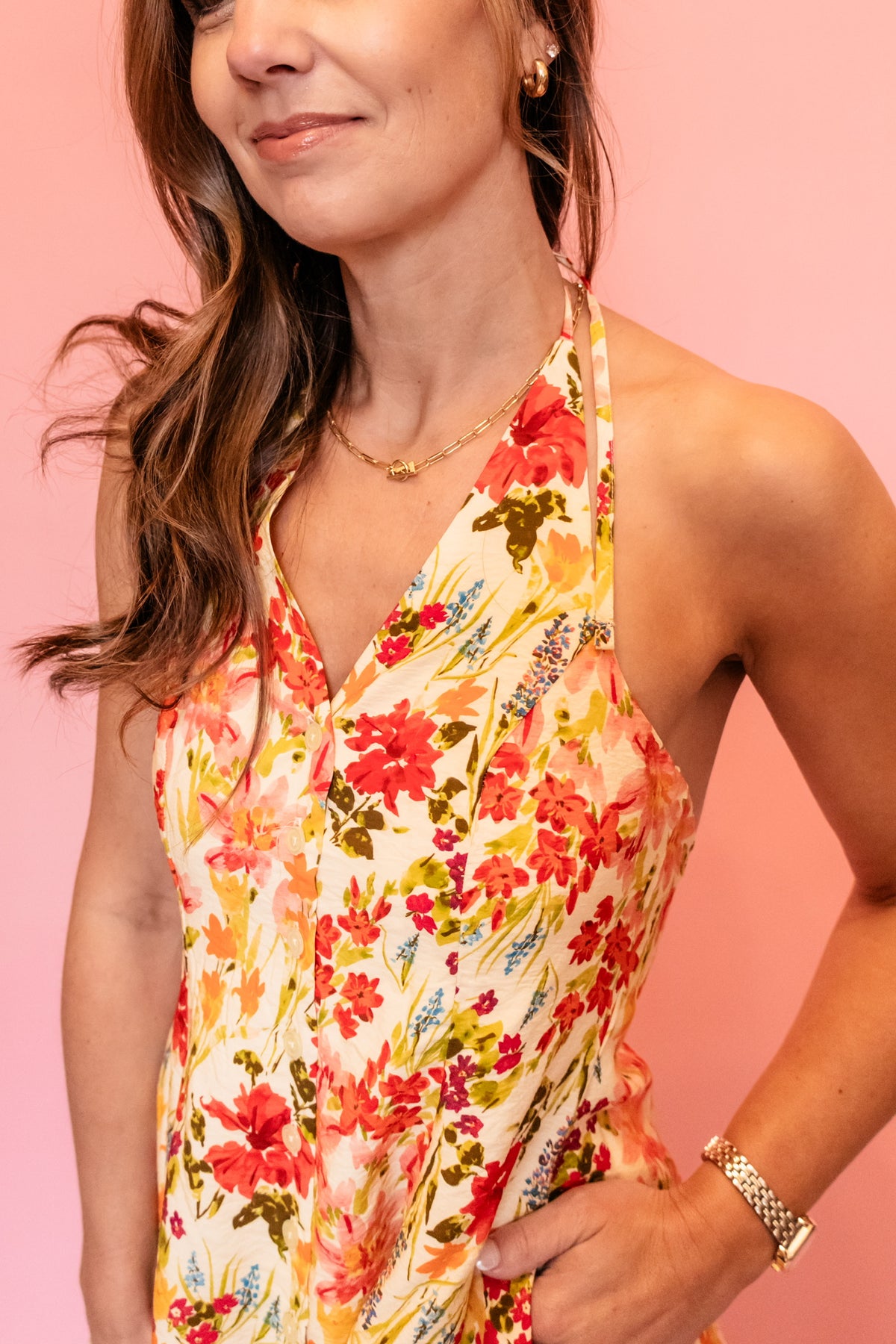 Brighten your wardrobe with this cheerful butter yellow dress featuring a vibrant floral pattern. The halter neckline offers a flattering, feminine silhouette, while the short cut keeps you cool and comfortable. Front button closure makes dressing effortless. Perfect for casual outings, garden parties, or sunny day adventures. A versatile piece that brings joy and color to any occasion.